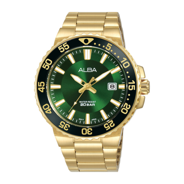 The Alba Men’s Active Analog Watch (Model AS9S74X1) exemplifies a blend of style and functionality. Its green patterned dial is complemented by luminous hour, minute, and second hands, ensuring clear readability in various lighting conditions. The inclusion of a date display adds to its everyday utility. Crafted with a stainless steel case and screw case back, this watch promises durability. The stainless steel wrap bracelet enhances its aesthetic appeal, offering a seamless blend of style and comfort. Protected by a mineral crystal, the watch face remains safeguarded against scratches. With a water resistance of up to 20 bar, it is suitable for daily activities, including swimming and snorkeling. This watch is a perfect accessory for men seeking a combination of elegance and resilience.