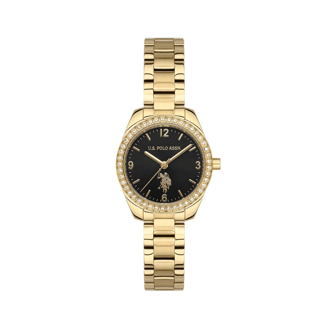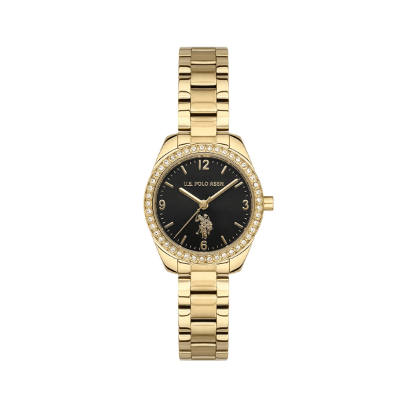 The USPA2064-03 combines elegance with modern design. Its 26 × 30 mm gold-tone stainless steel case houses a striking black dial, complemented by pavé crystal accents around the bezel. The watch is powered by quartz movement and features a mineral crystal. The matching gold-tone stainless steel bracelet adds a touch of sophistication, making it suitable for both casual and formal occasions. With a 5 ATM water resistance, it can withstand splashes and brief immersion but is not suitable for swimming.