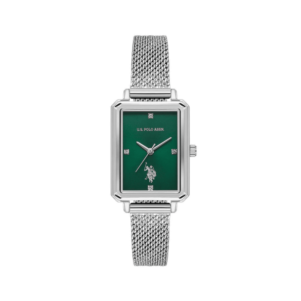 The USPA2083-02 combines elegance with modern design. Its 23.2 × 36.3 mm octagonal silver-tone stainless steel case houses a striking green dial, complemented by diamond-like accents at the hour markers. The watch is powered by quartz movement and features a mineral crystal. The silver-tone stainless steel mesh strap adds a contemporary touch, making it suitable for both casual and formal occasions. With a 3 ATM water resistance, it’s suitable for everyday wear but not for swimming.