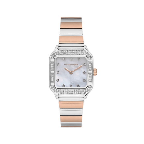 The USPA2100-05 is a refined timepiece designed for everyday elegance. It features a stainless steel case measuring approx. 28 mm × 34 mm with a thickness of about 9 mm. The case is finished in a metallic grey tone and is set with stone accents around the bezel. The dial is mother-of-pearl, adding a shimmering, elegant look, and the two-tone bracelet combines rose gold and silver stainless steel for a stylish contrast. It is powered by quartz movement and topped with mineral crystal glass. With a water resistance rating of 5 ATM (50 m), it’s suitable for daily wear including light splashes and rain, though not swimming. The watch comes backed by a 2-year international warranty.