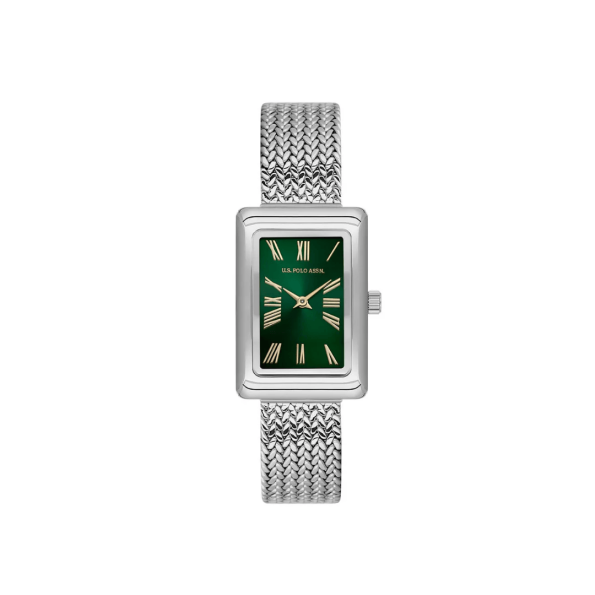The USPA2105-03 showcases a modern design with its 22 × 32 mm rectangular silver-tone stainless steel case. The watch is powered by quartz movement and features a mineral crystal. Its green dial adds a vibrant touch, while the matching silver-tone stainless steel mesh bracelet complements the overall aesthetic. With a 3 ATM water resistance, it’s suitable for everyday wear but not for swimming.