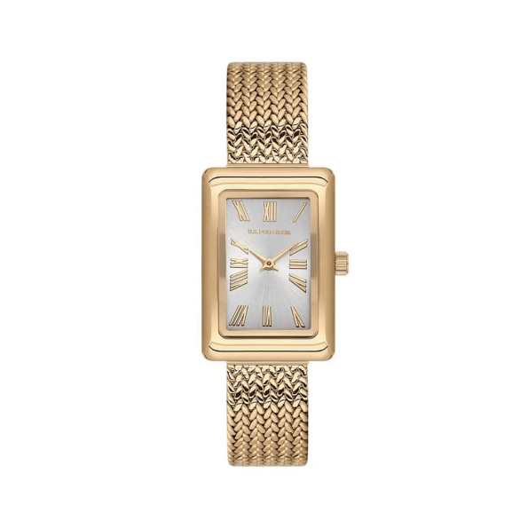 The USPA2105-04 showcases a classic design with its 22 × 32 mm rectangular gold-tone stainless steel case. The watch is powered by quartz movement and features a mineral crystal. Its metallic gray dial is complemented by gold-tone hands and markers, adding to its elegant appeal. The watch comes with a matching gold-tone stainless steel bracelet. With a 3 ATM water resistance, it’s suitable for everyday wear but not for swimming.