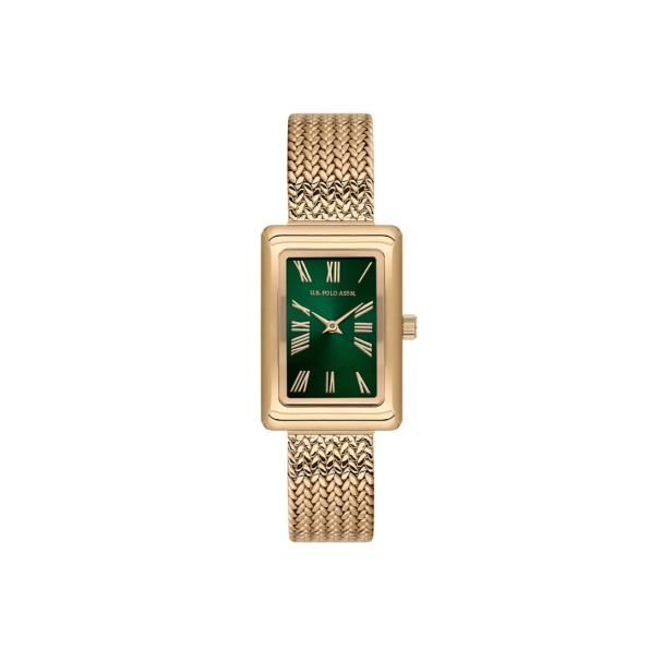 The USPA2105-06 showcases a classic design with its 22 × 32 mm rectangular gold-tone stainless steel case. The watch is powered by quartz movement and features a mineral crystal. Its green dial adds a vibrant touch, while the matching gold-tone stainless steel bracelet complements the overall aesthetic. With a 3 ATM water resistance, it’s suitable for everyday wear but not for swimming.
