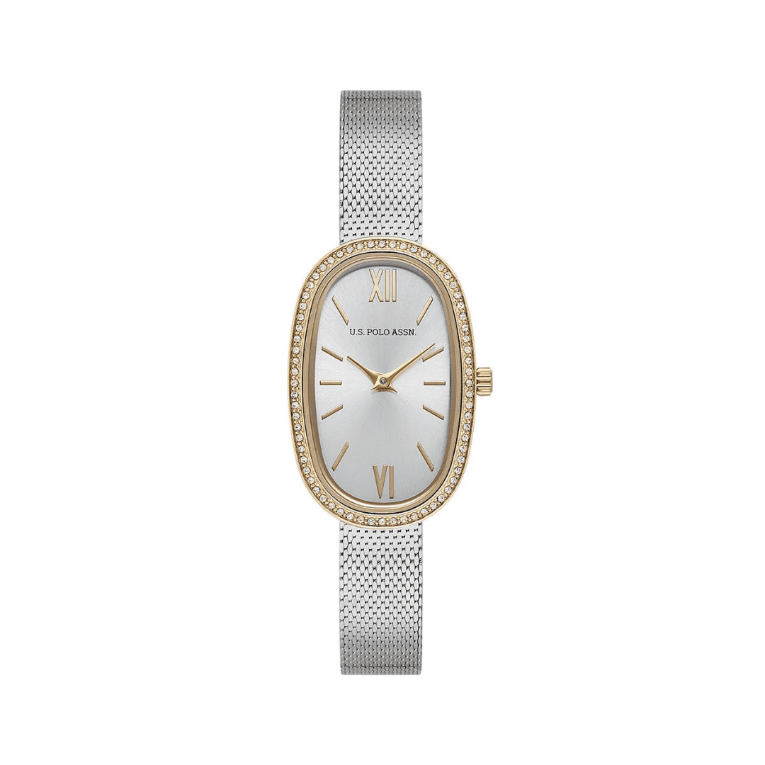 The USPA2106-02 combines classic elegance with modern design. Its 22 × 34 mm oval gold-tone stainless steel case encases a metallic gray dial, offering a sleek and minimalist aesthetic. The watch is powered by quartz movement and protected by a mineral crystal. The silver mesh strap adds a touch of refinement, making it suitable for both everyday wear and special occasions. With a 3 ATM water resistance, it can withstand splashes and brief immersion but is not suitable for swimming.