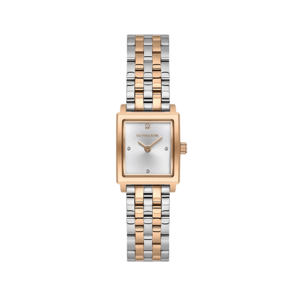 The USPA2107-03 is a compact, elegant women’s timepiece featuring a rectangular rose-gold stainless steel case and a metallic gray dial. It has a slim profile and a minimalist face that emphasizes clean lines and easy readability. The bracelet is stainless steel with two-tone (rose-gold + metallic gray) links for a refined contrast. The watch is powered by a quartz movement and protected by mineral crystal glass. Rated 3 ATM for basic splash resistance, it’s designed as a stylish everyday dress watch rather than a sports piece.