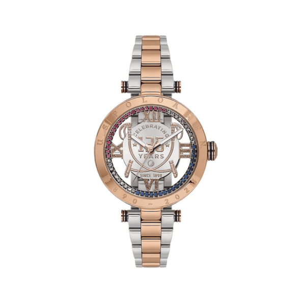 The USPA2119-01 showcases a timeless design with its 32 mm round rose gold-tone stainless steel case. The watch is powered by quartz movement and features a mineral crystal. Its metallic gray dial is complemented by rose gold-tone hands and markers, adding to its elegant appeal. The watch comes with a matching rose gold-tone stainless steel bracelet. With a 5 ATM water resistance, it’s suitable for everyday wear but not for swimming.