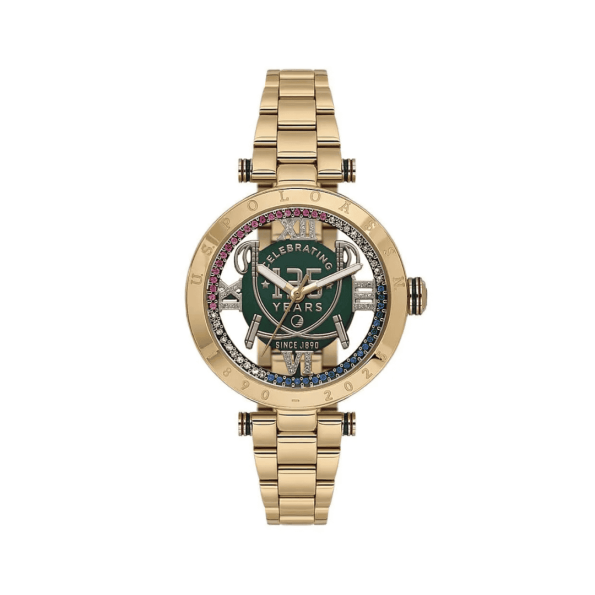 A limited-edition women’s watch featuring a gold-tone stainless steel case, vibrant green dial, and a bezel adorned with colorful stones.