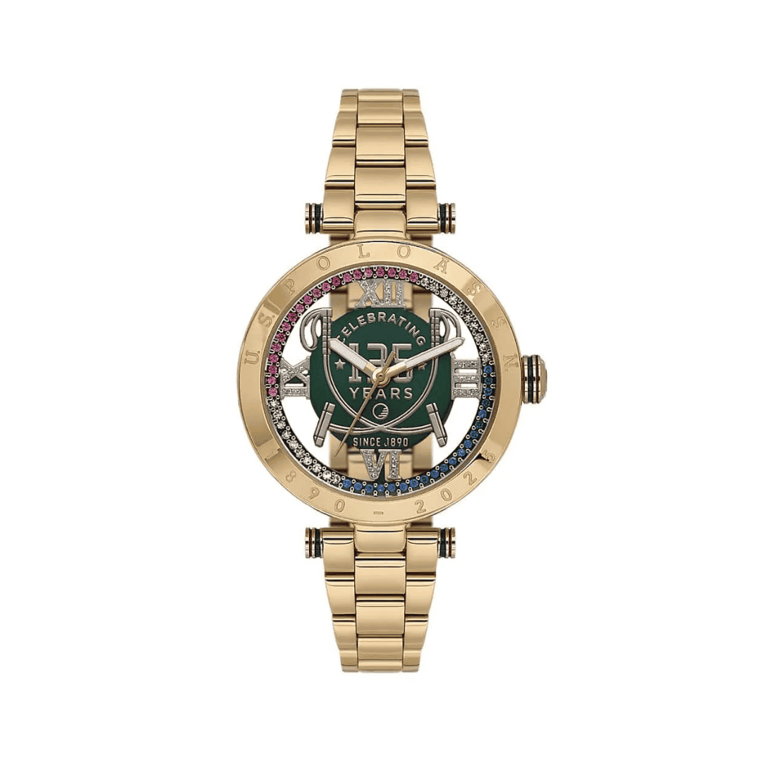 The USPA2119-02 commemorates the 135th anniversary of U.S. Polo Assn. with a design that blends elegance and heritage. The watch boasts a 32 mm round gold-tone stainless steel case and a green dial that exudes sophistication. The bezel is embellished with colorful stones, adding a touch of glamour. The watch is powered by quartz movement and features a mineral crystal. Its matching gold-tone stainless steel bracelet complements the overall aesthetic. With a 5 ATM water resistance, it’s suitable for everyday wear but not for swimming.