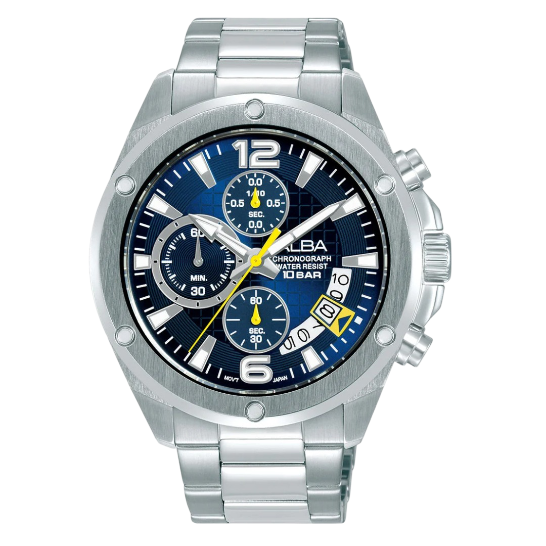 The Alba Active Men’s Chronograph Watch – Model AM3987X1 is tailored for individuals seeking both style and performance. The 43mm stainless steel case is distinguished by six real screws, lending a robust and industrial aesthetic. The blue dial is enhanced with yellow accents, creating a striking contrast that exudes sophistication. This chronograph model is equipped with a 60-minute timer accurate to 1/10th of a second and supports split time measurements, catering to various timing needs. The watch is powered by a reliable quartz movement, ensuring precise timekeeping. The stainless steel bracelet not only adds to its durability but also provides a comfortable fit, secured with a three-fold clasp with a push-button release. With a water resistance of up to 10 bar (100 meters), this watch is suitable for everyday wear, including swimming and snorkeling. The mineral crystal protects the dial, maintaining its clarity over time.