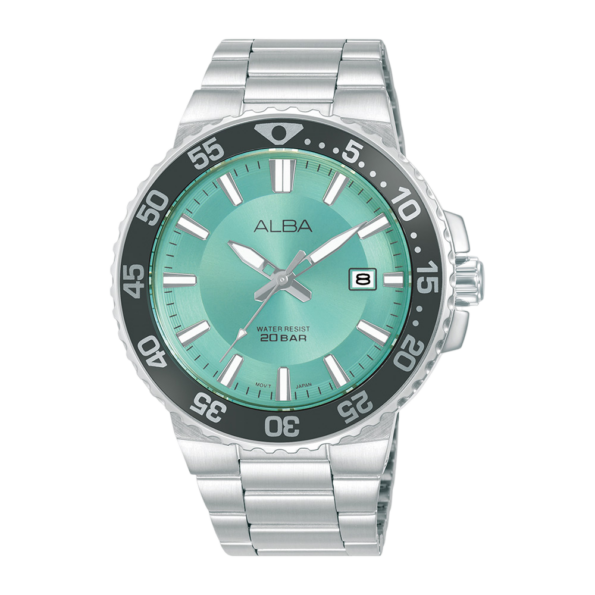 The Alba Men’s Active Analog Watch (Model AS9S87X1) exemplifies a blend of style and functionality. Its turquoise dial is complemented by hour, minute, and second hands, ensuring clear readability in various lighting conditions. The inclusion of a date display adds to its everyday utility. Crafted with a stainless steel case and screw case back, this watch promises durability. The stainless steel wrap bracelet enhances its aesthetic appeal, offering a seamless blend of style and comfort. Protected by a mineral crystal, the watch face remains safeguarded against scratches. With a water resistance of up to 20 bar, it is suitable for daily activities, including swimming and snorkeling. This watch is a perfect accessory for men seeking a combination of elegance and resilience.