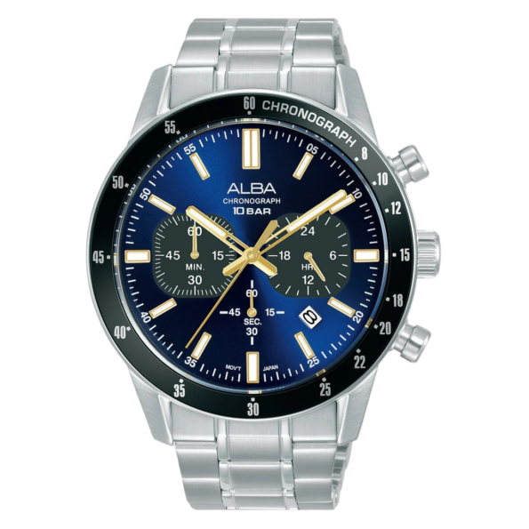 The Alba Men’s Active Chronograph Watch – Model AT3J73X1 is designed for individuals who seek both style and performance. The 44mm stainless steel case houses a striking dark blue dial, complemented by luminous hands and hour markers, ensuring readability in various lighting conditions. This chronograph watch features sub-dials for measuring elapsed time, adding to its functionality. Powered by a precise quartz movement, it offers accurate timekeeping and includes a convenient date display. The stainless steel bracelet enhances its durability and is secured with a three-fold clasp with a push-button release for a comfortable fit. With a water resistance of up to 10 bar (100 meters), this watch is suitable for daily wear, including swimming and snorkeling. The mineral crystal protects the dial, maintaining its clarity over time.
