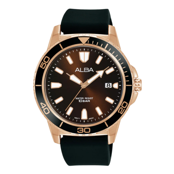 The Alba Men’s Active Quartz Watch – Model AS9U14X1 is designed for individuals who seek both style and performance. The 42mm stainless steel case with a rose gold-tone finish houses a black dial, complemented by luminous hands and hour markers, ensuring readability in various lighting conditions. Powered by the precise Alba VJ42 quartz movement, it offers accurate timekeeping and includes a convenient date display at the 3 o’clock position. The black silicone strap enhances comfort and durability, secured with a traditional buckle clasp for a snug fit. With a water resistance of up to 10 ATM (100 meters), this watch is suitable for daily wear, including swimming and snorkeling. The mineral crystal protects the dial, maintaining its clarity over time.