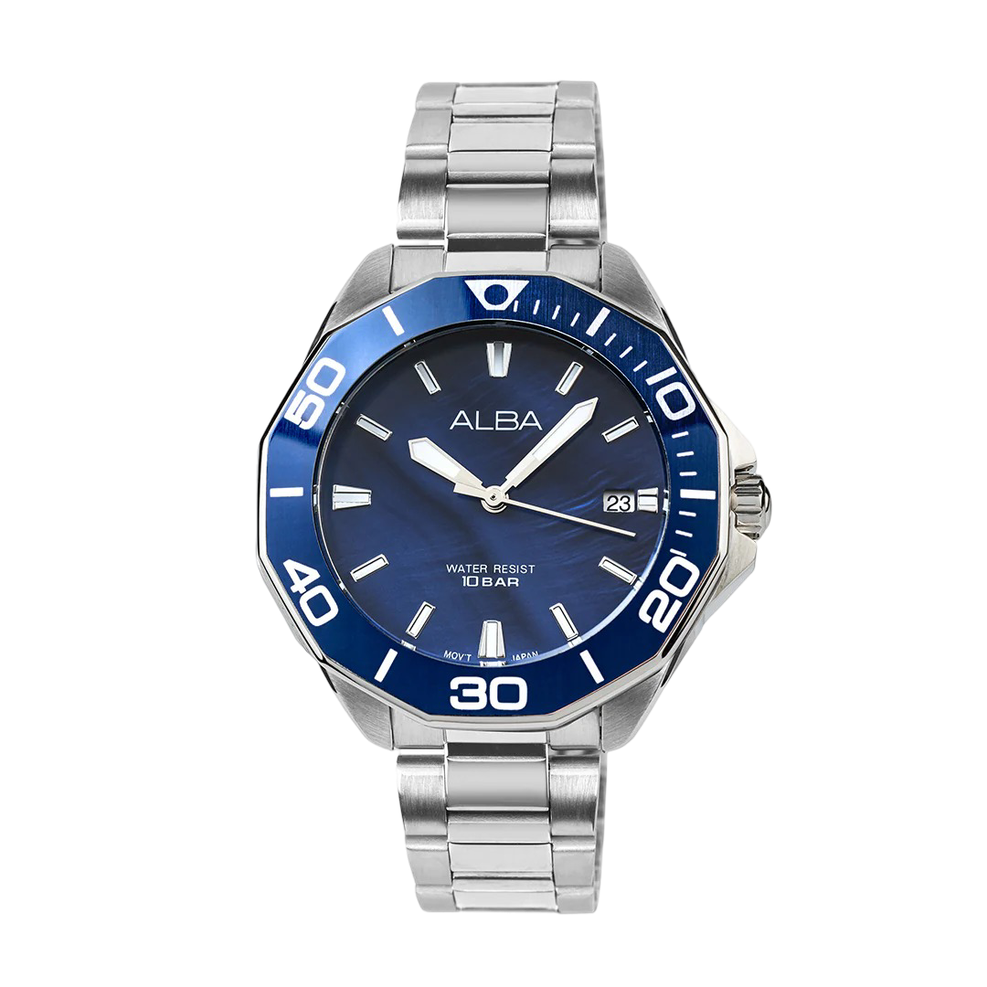 The Alba Women’s Deep Blue Watch – Model AG8P25X1 showcases a modern design with a 36mm stainless steel case and bracelet. The deep blue dial is adorned with luminescent hands and index hour markers, ensuring readability in various lighting conditions. A date display adds to its practicality. The watch is powered by the reliable VJ32 quartz movement and protected by a mineral crystal. With a water resistance of up to 10 bar (100 meters), it is suitable for everyday wear, including swimming and snorkeling. The combination of its sleek design and functional features makes this watch a valuable addition to any woman’s collection.