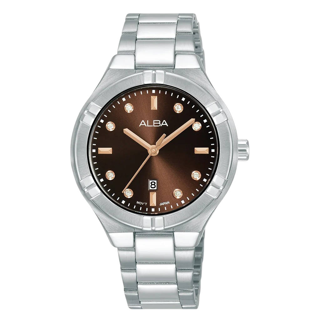 The Alba Women’s Fashion Quartz Watch – Model AH7DC9X1 is crafted for women who appreciate a blend of style and precision. The 34mm stainless steel case houses a brown dial, complemented by silver-tone hands and hour markers, offering a sleek and timeless look. Powered by the reliable Alba VJ22 quartz movement, it ensures accurate timekeeping and includes a convenient date display. The stainless steel bracelet adds to its sophistication and durability, secured with a fold-over clasp for a comfortable fit. With a water resistance of up to 5 ATM (50 meters), this watch is suitable for daily wear and can withstand splashes and brief immersion in water. The scratch-resistant mineral crystal protects the dial, maintaining its clarity over time.