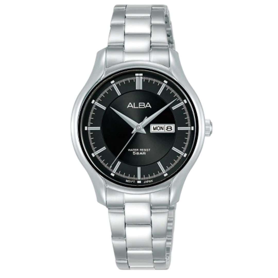 The Alba AN8107X1 combines classic elegance with everyday functionality, featuring a sleek black dial, stainless steel bracelet, and day-date display.