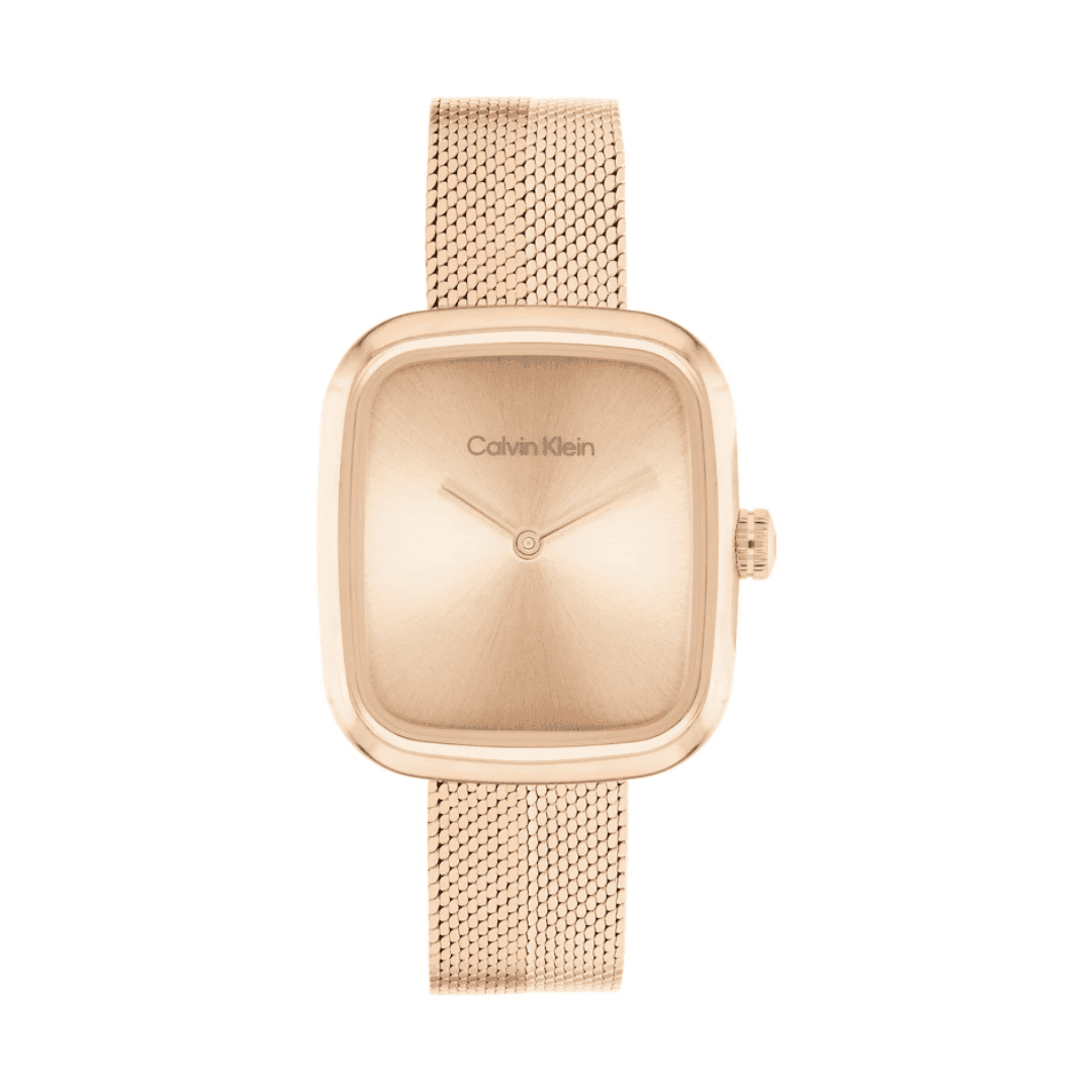 A refined ladies’ quartz fashion watch in Calvin Klein’s Adore line. It features a sleek rectangular or softly square-rectangular rose-gold tone case matched with a rose gold mesh bracelet. The minimalist dial emphasizes simplicity, with just the essential hands against a matching rose gold background. It’s designed more for style and everyday elegance than for heavy duty functions or sporty use.