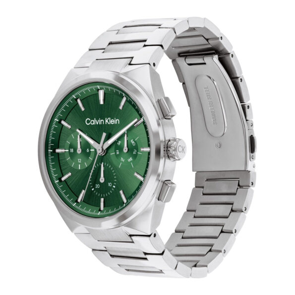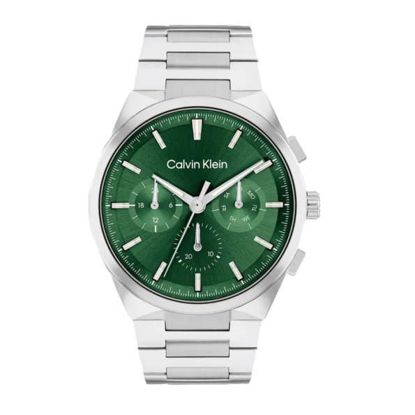 The Calvin Klein Distinguish Men’s Watch – Model 25200441 showcases a refined design with a 44mm stainless steel case and bracelet. The green dial is complemented by silver-tone hands and index markers, ensuring clear readability. The watch features both day and date displays, providing practicality for daily wear. Powered by a reliable quartz movement from Seiko Instruments Inc., it ensures precise timekeeping. The mineral crystal protects the dial from scratches, and with a water resistance of up to 3 ATM (30 meters), it is suitable for everyday activities like handwashing and light splashes.