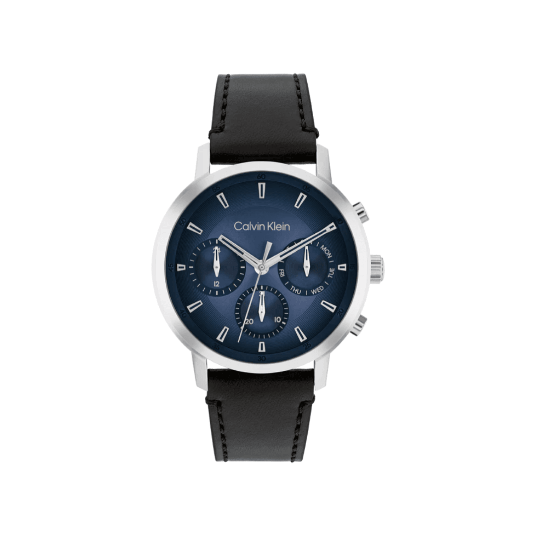 A contemporary men’s watch featuring a 42 mm stainless steel case, blue dial with day, date, and 24-hour sub-dials, black leather strap, Ronda quartz movement, and 3 ATM splash resistance.