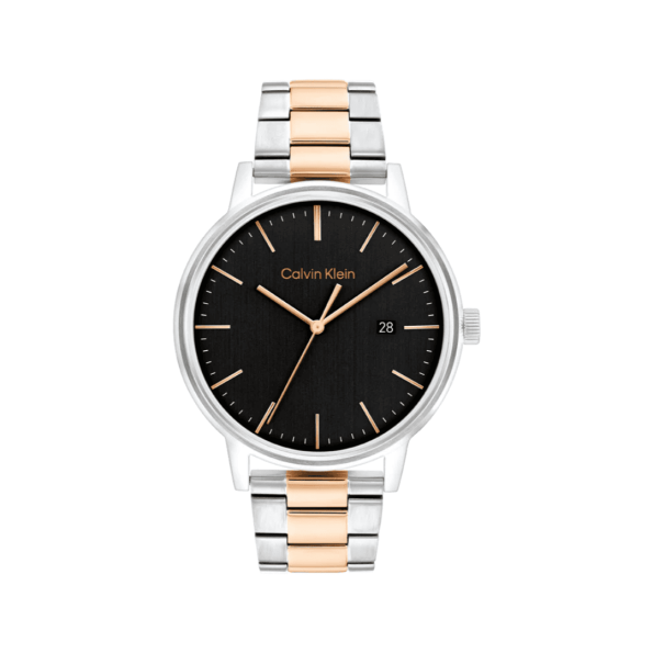 The Calvin Klein Linked Bracelet 25200479 is an elegant men’s timepiece that blends modern design with functional appeal. It features a 43 mm stainless steel case housing a sleek black dial, completed with a champagne and silver two-tone linked bracelet. The minimalist dial is paired with a three-hand quartz movement and a discreet date window for everyday practicality. Protected by mineral glass and rated to 3 ATM (30 meters) water resistance, this timepiece handles daily wear with ease while maintaining a refined aesthetic.