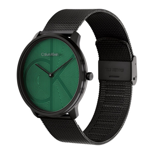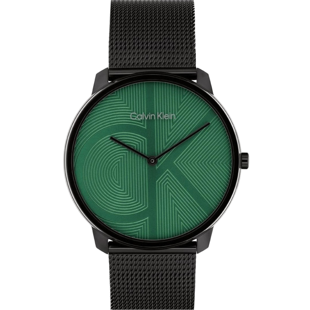 The Calvin Klein Men’s Iconic Watch boasts a 40mm stainless steel case with a green dial, paired with a black stainless steel bracelet. Its distinctive color combination offers a modern and stylish look.