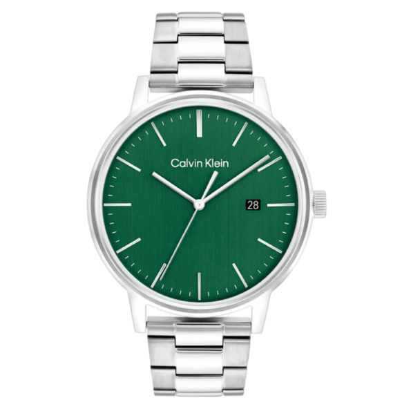 The Calvin Klein Men’s Linked Bracelet Watch features a 43mm stainless steel case with a green dial. It is complemented by a stainless steel bracelet and offers water resistance up to 30 meters, making it both stylish and functional for daily wear.