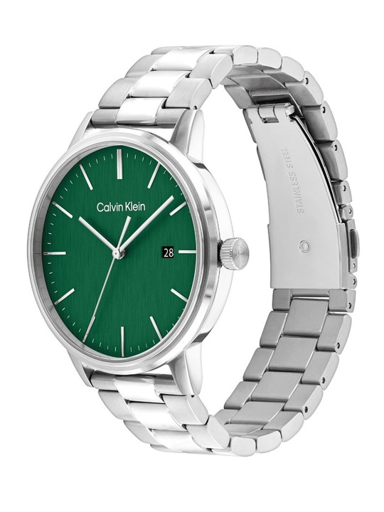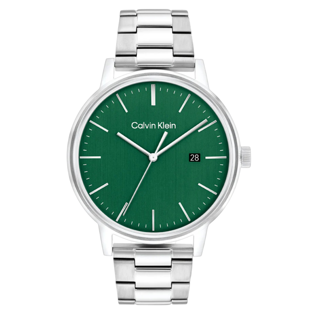This Calvin Klein timepiece boasts a modern design with a 43mm stainless steel case and an eye-catching green dial, adding a touch of color to your ensemble. The stainless steel bracelet provides a seamless and durable fit. With a water resistance of up to 30 meters, it is suitable for everyday activities, including handwashing and exposure to rain. The watch operates on a precise quartz movement, ensuring accurate timekeeping.