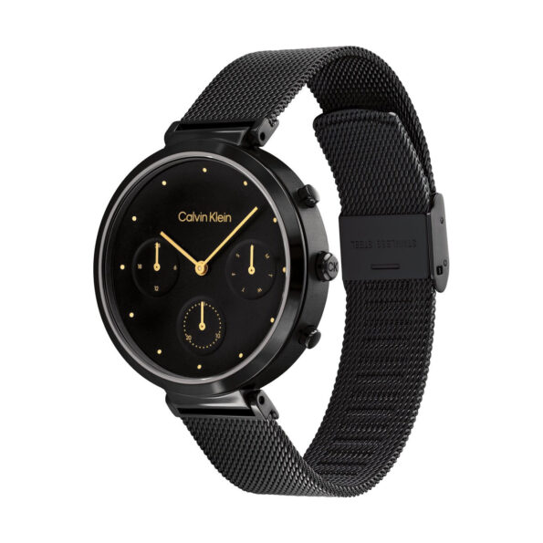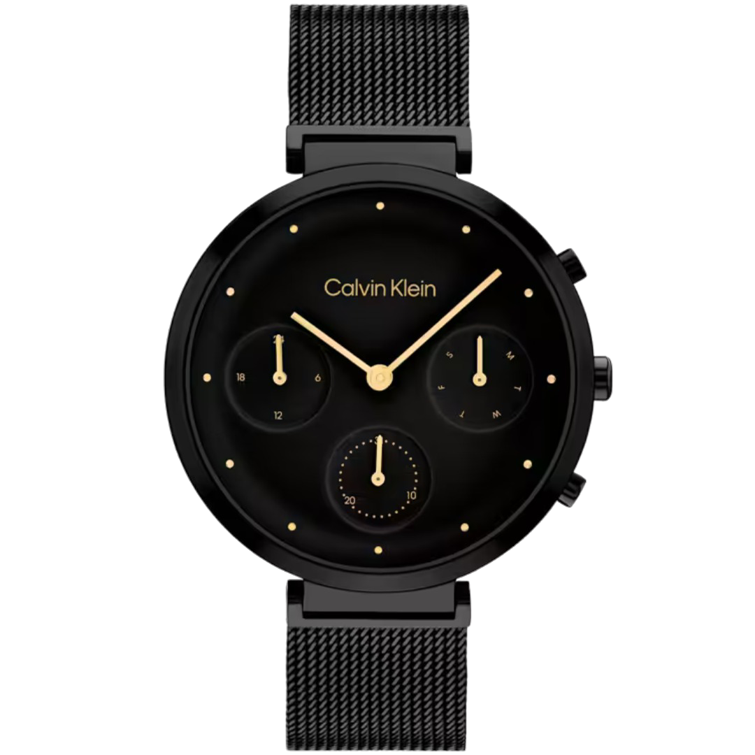 The Calvin Klein Minimalistic T-Bar Women’s Watch – Model 25200282 showcases the brand’s commitment to clean lines and understated elegance. The 37mm stainless steel case houses a white dial equipped with multifunction sub-dials, offering additional functionalities while maintaining a minimalist aesthetic. The stainless steel bracelet complements the overall design, providing durability and a polished look. Powered by a reliable quartz movement, this timepiece ensures precise timekeeping. The mineral crystal protects the dial from scratches, while the folding clasp ensures secure and comfortable wear. With a water resistance of up to 3 ATM (30 meters), this watch is suitable for everyday wear, including exposure to splashes and brief immersion in water.
