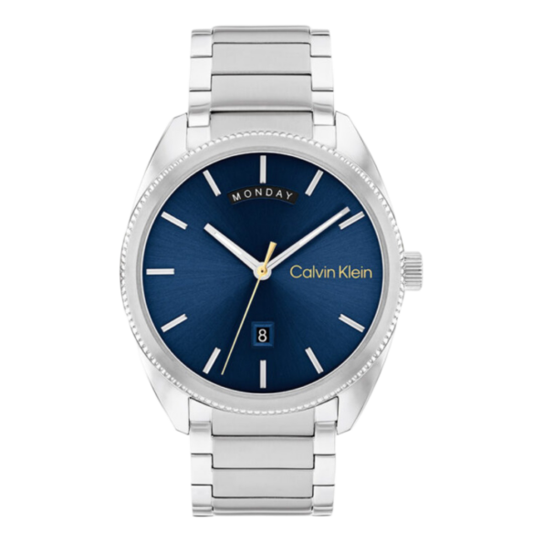 The Calvin Klein Progress Men’s Watch – Model 25200446 embodies modern elegance with its 42mm stainless steel case and matching bracelet. The blue dial is designed with luminous hands and markers, ensuring visibility in low-light conditions. A date window adds functionality to the timepiece. This watch operates on a precise quartz movement, offering reliable timekeeping. The mineral crystal safeguards the dial from everyday scratches. With a water resistance of 3 ATM (30 meters), it can withstand daily activities such as handwashing and minor splashes.