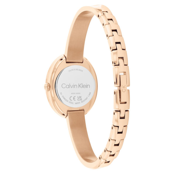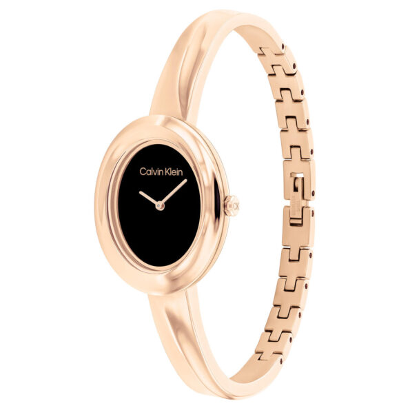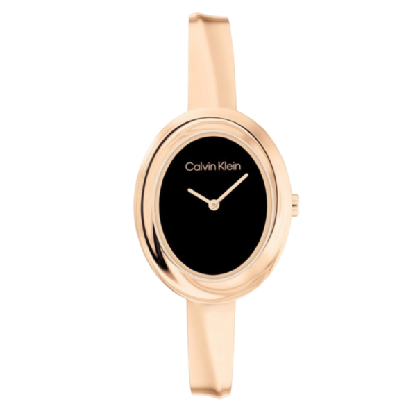The Calvin Klein Twisted Bezel Women’s Watch – Model 25100057 showcases a unique and elegant design. The 24mm oval rose gold ion-plated stainless steel case is complemented by a pearlized black dial, adorned with rose gold-tone hands, offering a subtle contrast for easy readability. The twisted bezel adds a touch of sophistication to the overall design. The matching rose gold-tone stainless steel bangle bracelet enhances its stylish appeal, making it suitable for various outfits and events. Powered by a reliable Japanese quartz movement, this watch ensures precise timekeeping. The mineral crystal protects the dial from scratches, and with a water resistance of up to 3 ATM (30 meters), it is suitable for everyday activities like handwashing and light splashes.