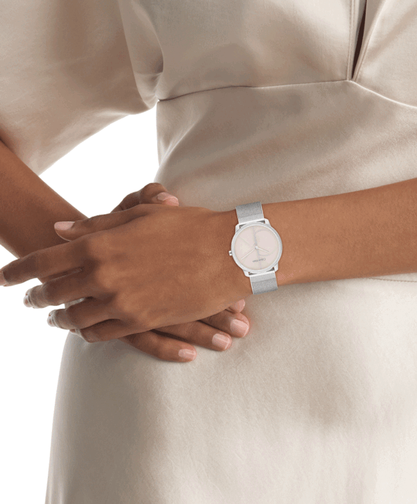 This elegant timepiece for women showcases a silver-tone stainless steel case and a matching mesh bracelet, reflecting Calvin Klein’s commitment to contemporary design. The minimalist dial adds to its sophisticated appeal. Equipped with a quartz movement, it offers reliable timekeeping. The watch is water-resistant up to 30 meters, making it practical for daily wear.