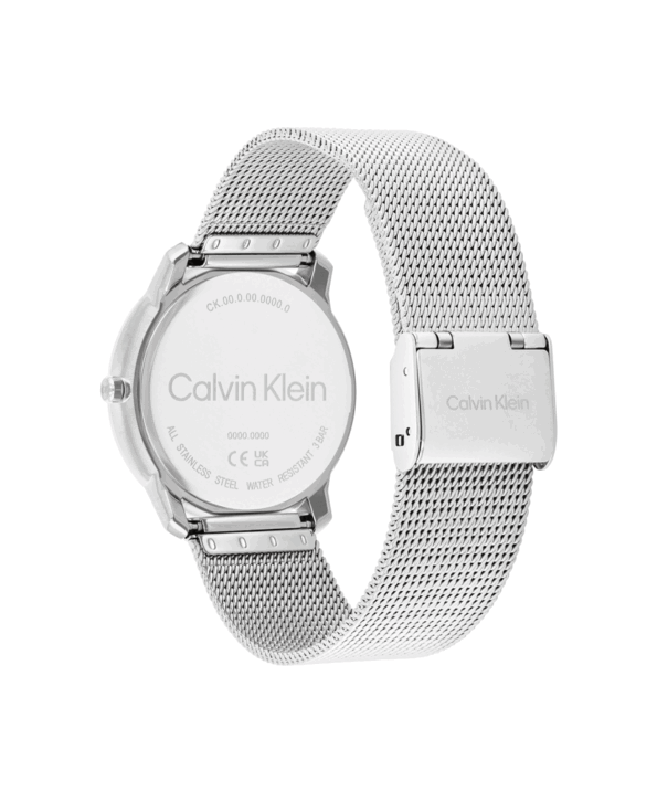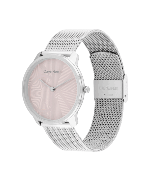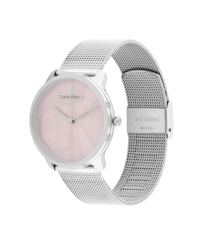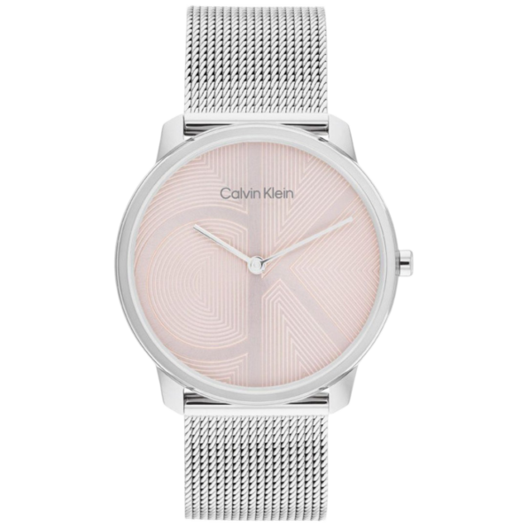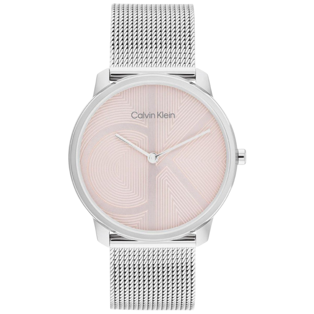 The Calvin Klein Women’s Iconic Watch features a silver-tone design with a stainless steel case and mesh bracelet, exuding modern elegance.