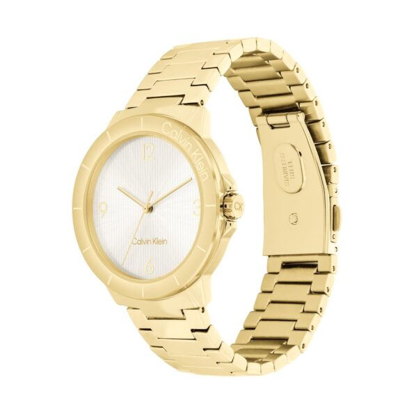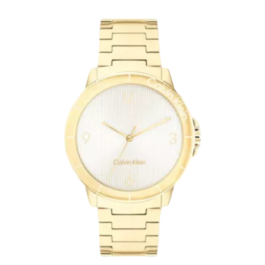 A sophisticated gold-tone timepiece featuring a white-patterned dial and a sleek stainless steel bracelet. This watch embodies Calvin Klein’s minimalist aesthetic, making it a versatile accessory for any occasion.