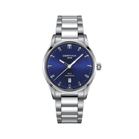 The Certina DS-2 Precidrive (C024.410.11.041.20) is a 40 mm men’s quartz watch featuring a blue sunray dial, ETA F06.411 Precidrive movement with ±10 seconds/year accuracy, sapphire crystal, and 100 m water resistance.