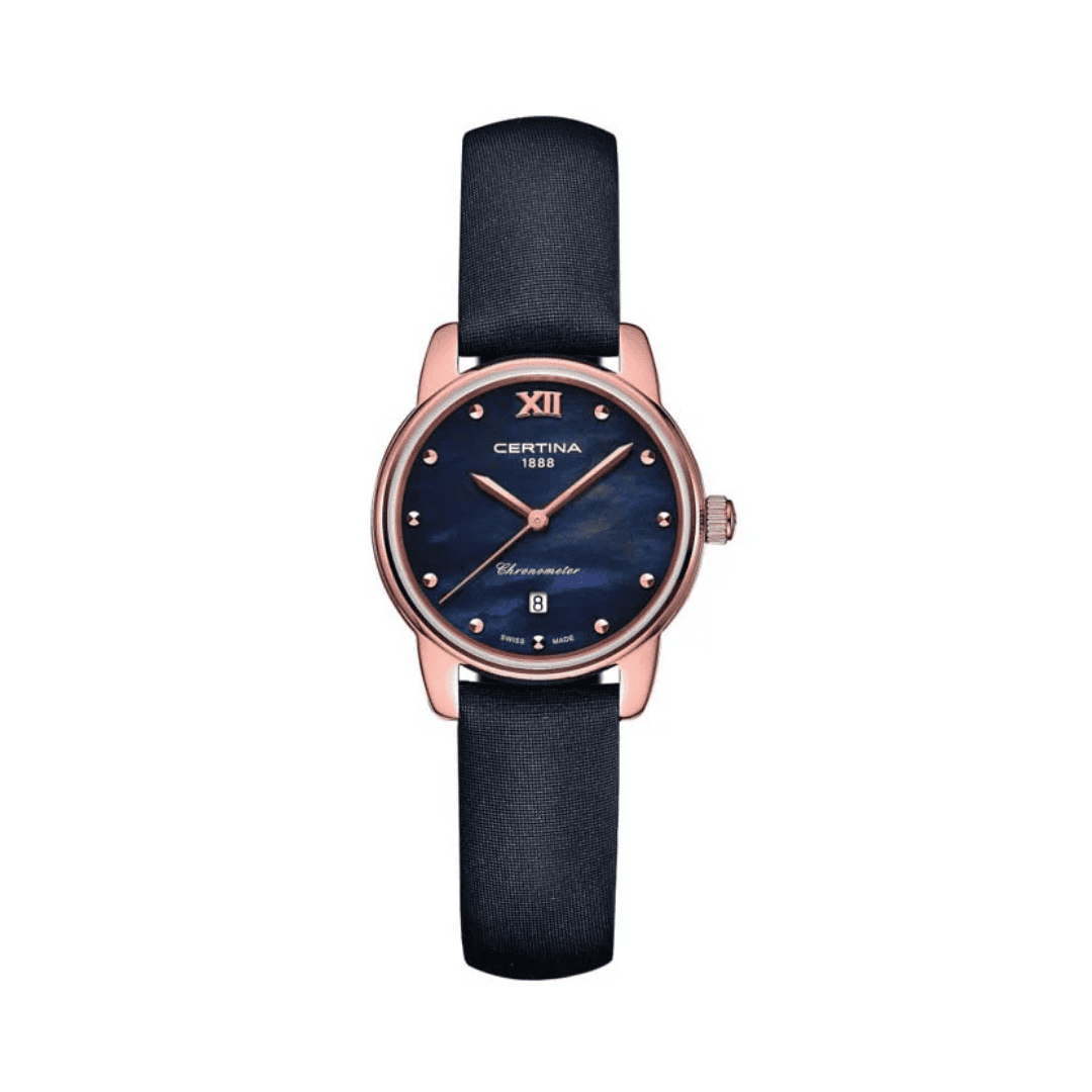 The Certina DS-8 Lady (C033.051.36.128.00) is a 27.5 mm women’s quartz watch featuring a black mother-of-pearl dial, ETA F03.411 Precidrive movement with ±10 seconds/year accuracy, sapphire crystal, and 100 m water resistance.