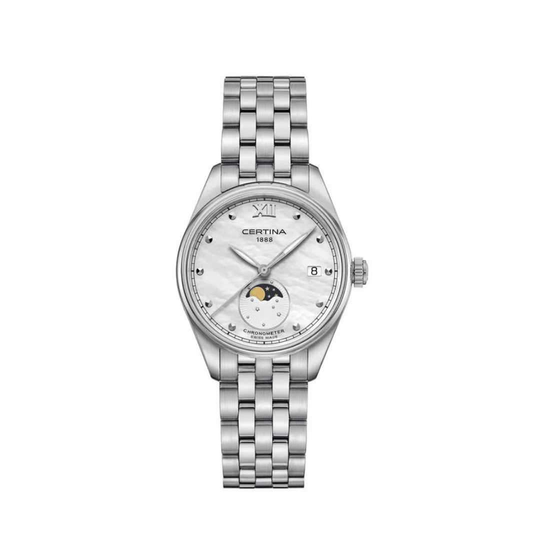 The Certina DS-8 Moon Phase Lady (C033.257.11.118.00) is a 32.5 mm women’s quartz watch featuring a white mother-of-pearl dial, Precidrive movement with ±10 seconds/year accuracy, sapphire crystal, and 100 m water resistance.