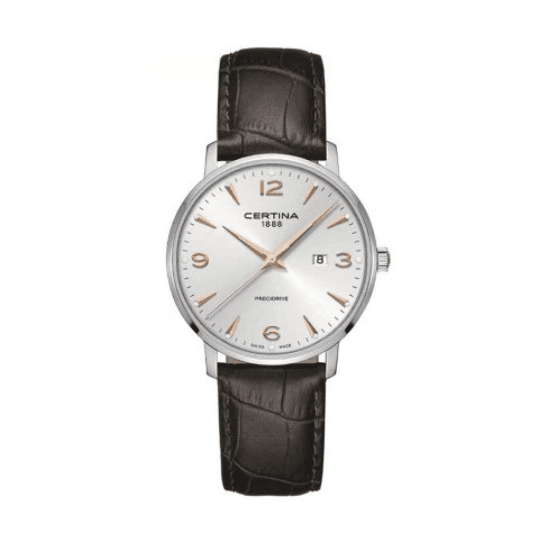 The Certina DS Caimano Gent Precidrive (C035.410.16.037.01) is a refined men’s dress watch with a 39 mm stainless-steel case, silver dial, and brown leather strap. It combines high precision from the ETA Precidrive movement with enduring build quality from the DS system—a perfect blend of elegance and resilience.