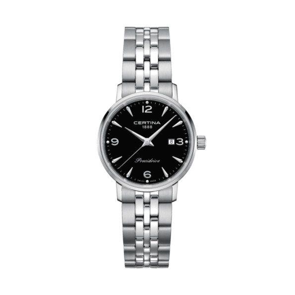 The Certina DS Caimano Lady (C035.210.11.057.00) is a 28 mm women’s stainless-steel watch featuring a black dial, Precidrive quartz movement, sapphire crystal, and DS protection with 100 m water resistance.