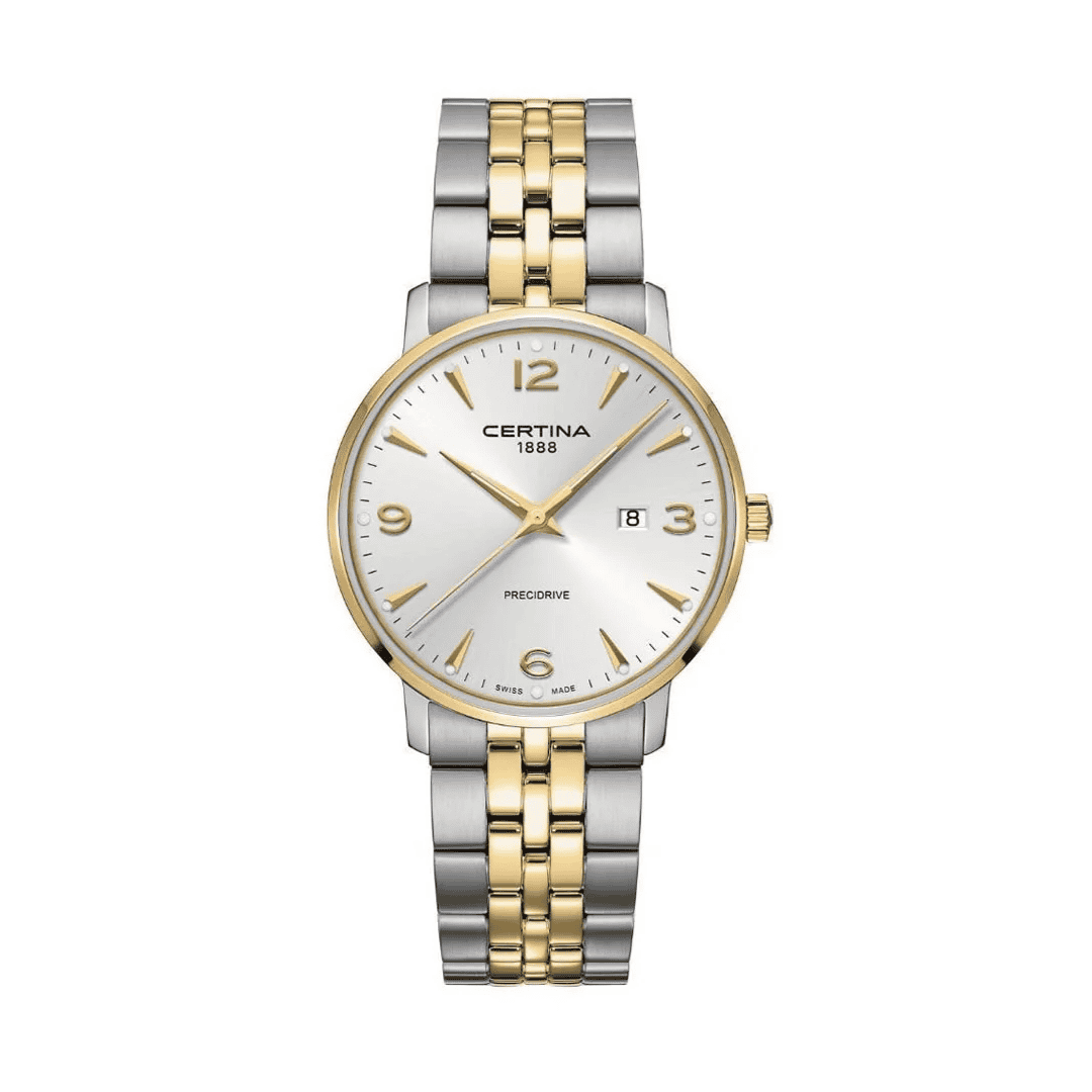 The Certina DS Caimano Lady (C035.210.22.037.02) is a stylish women’s quartz watch featuring a 28 mm two-tone case and bracelet, silver dial, Precidrive movement, luminescent dial, DS protection, and 100 m water resistance. Sleek, accurate, and durable.