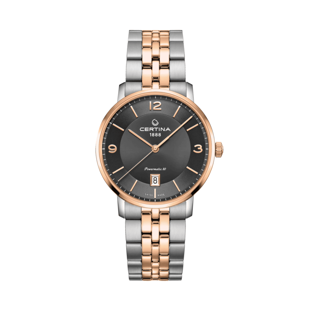 The Certina DS Caimano Powermatic 80 (C035.407.22.087.01) is a refined and sporty men’s timepiece that combines elegant aesthetics with Certina’s robust engineering. Featuring a grey dial and matching two-tone bracelet, this 39 mm watch is powered by a reliable Swiss automatic movement. With a compact, lightweight design and 100 m water resistance, it’s equally suited for everyday wear or light water activities.