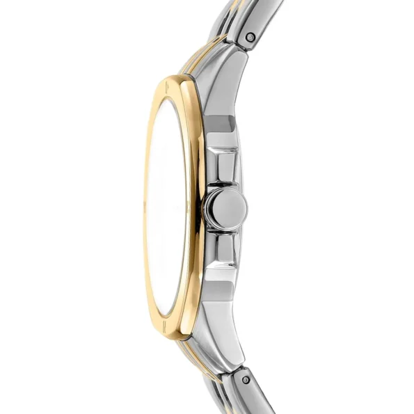 A stylish timepiece featuring a two-tone stainless steel design with a silver dial, offering a blend of elegance and modernity suitable for various occasions.
