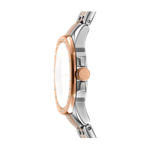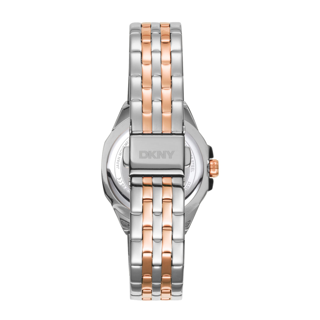 The DKNY Brooklyn Mini Women’s Watch – Model DK1L013M0105 showcases a clean and sophisticated design with its white mother-of-pearl dial and two-tone stainless steel case. The 30mm case houses a minimalist dial, providing a modern look. The watch operates on a precise quartz movement, ensuring accurate timekeeping. Its matching stainless steel bracelet adds durability and style to the overall look. Ideal for those who appreciate minimalist aesthetics with a hint of luxury, this timepiece seamlessly blends style and functionality.