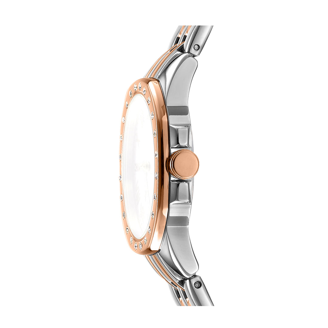 A refined timepiece featuring a white mother-of-pearl dial set within a two-tone stainless steel case, complemented by a matching stainless steel bracelet. This watch offers a minimalist design with a touch of elegance, making it suitable for various occasions.
