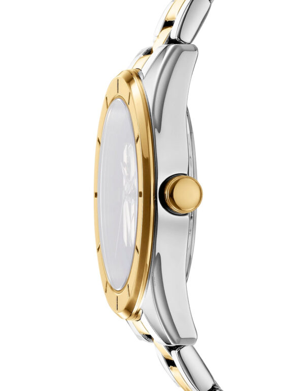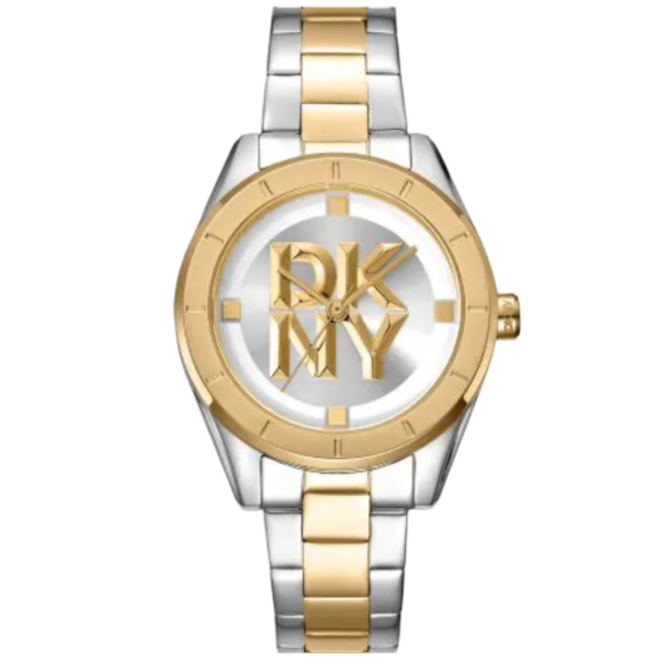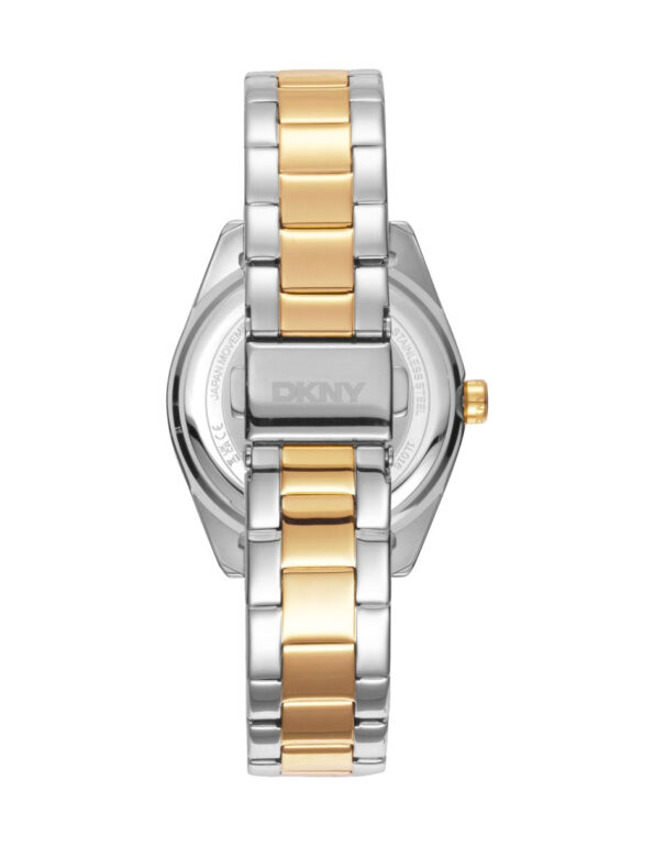 The DKNY Chambers Midi Women’s Watch – Model DK1L016M0085 showcases a refined aesthetic with its two-tone silver and gold-tone stainless steel case and bracelet. The 34mm case houses a minimalist silver-white dial, providing a clean and sophisticated look. Equipped with a precise quartz movement, it ensures accurate timekeeping. The watch’s water resistance up to 5 ATM adds practicality, making it suitable for daily wear, including exposure to splashes and rain. Its versatile design transitions seamlessly from casual to formal settings, embodying DKNY’s commitment to merging fashion with functionality.