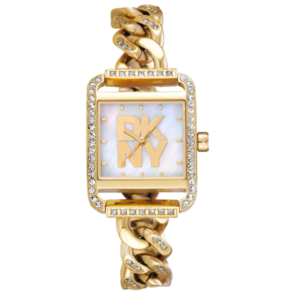 The DKNY Women’s Iconic City Glitz Watch – Model DK1L080M0025 combines elegance with a touch of glamour. Its rectangular gold-tone stainless steel case measures 27mm in width and 34.5mm in length, housing a lustrous mother-of-pearl dial adorned with crystal accents that catch the light beautifully. The watch is powered by a reliable quartz movement, ensuring precise timekeeping. A mineral crystal protects the dial from scratches, while the stainless steel bracelet adds durability and sophistication. With water resistance up to 3 ATM (30 meters), this timepiece is suitable for everyday wear, including exposure to splashes and brief immersion in water.