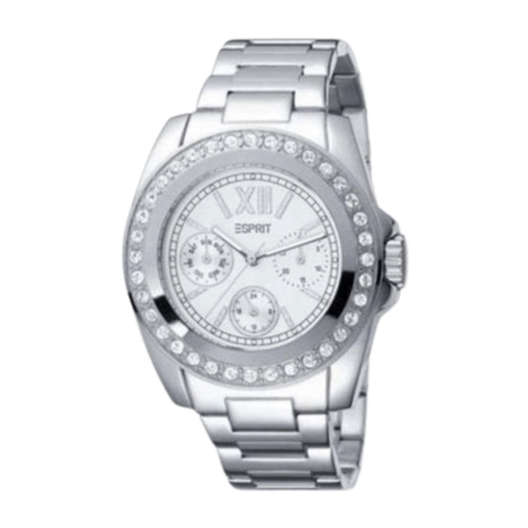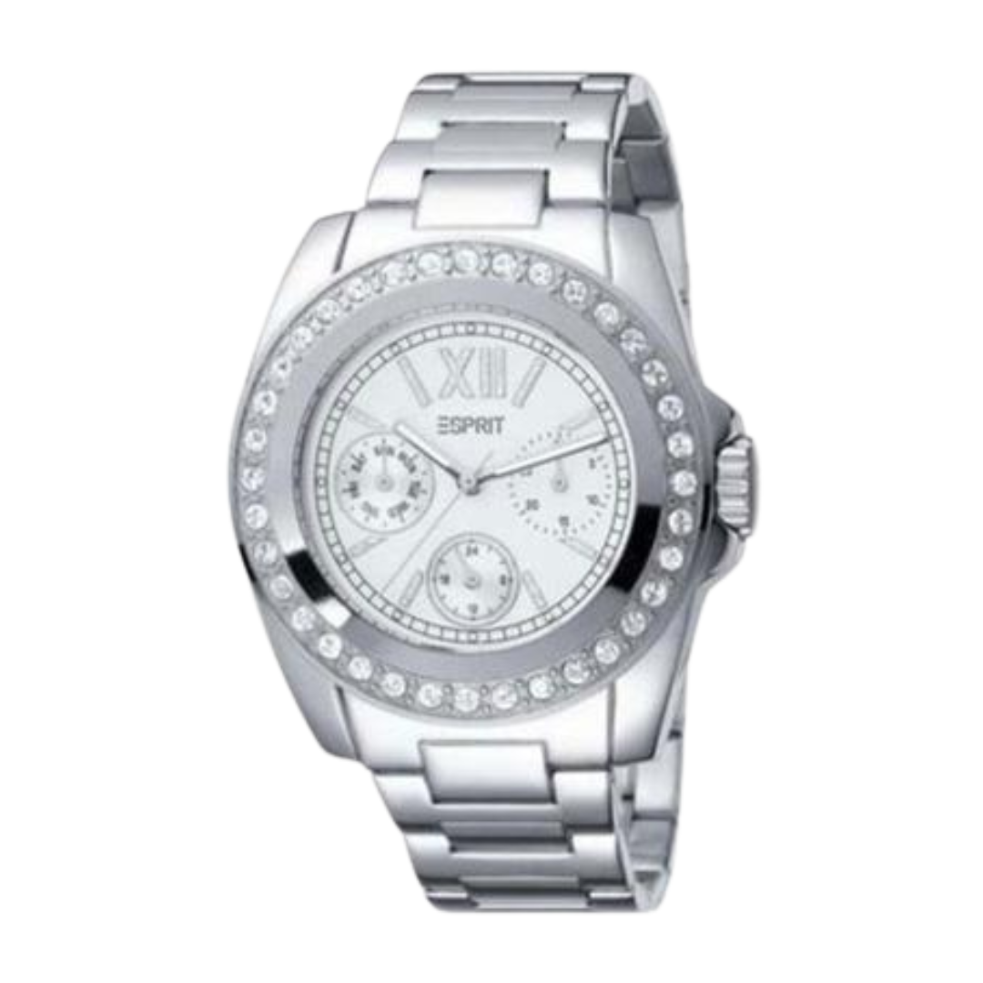 The Esprit Glam Rock watch combines edgy design with silver elegance, making it a bold fashion statement for modern women.
