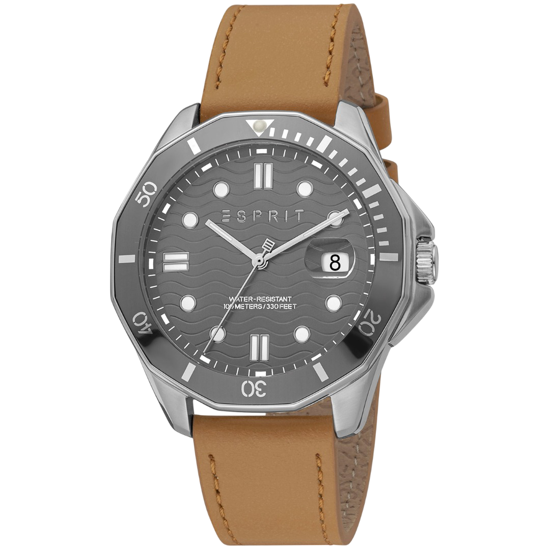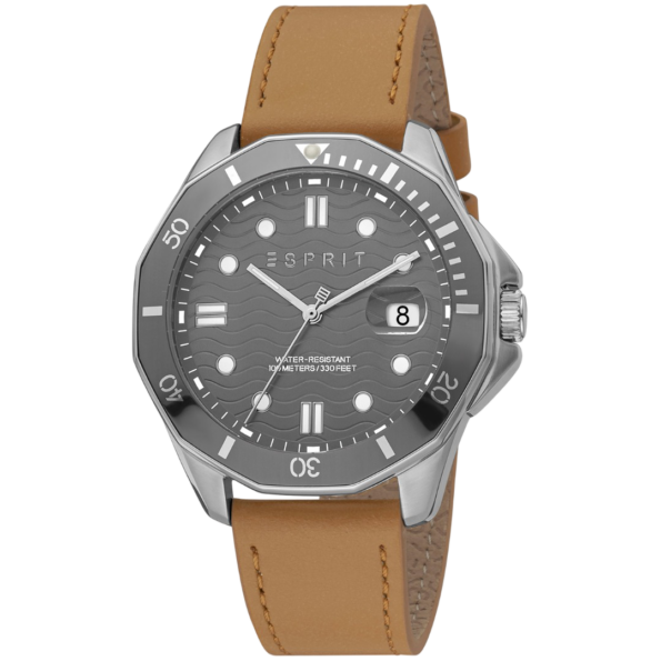 The Esprit Men’s Kale Watch – Model ES1G367L0035 showcases a sleek design with a 43mm stainless steel case paired with a brown leather strap. The iron grey dial offers a clear analog display, complemented by a date indicator for added convenience. Powered by a reliable quartz movement, this watch ensures accurate timekeeping. The mineral crystal protects the dial from scratches, maintaining its pristine appearance. With a water resistance of up to 100 meters (10 ATM), it is suitable for various activities, including swimming and snorkeling. The combination of its modern design and functional features makes this watch a versatile accessory for any man’s collection.