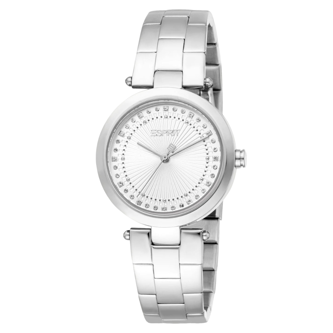 The Esprit Women’s Autumn Watch – Model ES1L455M0045 combines contemporary aesthetics with functionality. It features a 30mm stainless steel case that houses a silver dial adorned with minimalist hour markers, providing a clean and sophisticated look. The stainless steel bracelet complements the overall design, ensuring durability and comfort. Powered by a reliable quartz movement and protected by a mineral crystal, this watch is built to withstand daily wear. With a water resistance of 3 ATM (30 meters), it is suitable for everyday activities, including hand washing.