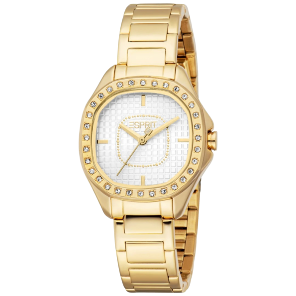 The Esprit Women’s Calista Watch – Model ES1L458M0025 combines contemporary aesthetics with functionality. It features a 30mm stainless steel case that houses a gold-tone dial adorned with minimalist hour markers, providing a clean and refined look. The matching gold-tone stainless steel bracelet enhances its elegance, ensuring durability and comfort. Powered by a reliable quartz movement and protected by a mineral crystal, this watch is built to withstand daily wear. With a water resistance of 3 ATM (30 meters), it is suitable for everyday activities, including hand washing.