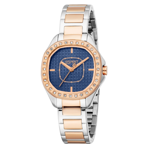 The Esprit Women’s Calista Watch – Model ES1L458M0065 combines contemporary aesthetics with functionality. It features a 30mm stainless steel case that houses a dark blue dial adorned with minimalist hour markers, providing a clean and refined look. The two-tone stainless steel bracelet, blending silver and rose gold hues, enhances its elegance and versatility, ensuring durability and comfort. Powered by a reliable quartz movement and protected by a mineral crystal, this watch is built to withstand daily wear. With a water resistance of 3 ATM (30 meters), it is suitable for everyday activities, including hand washing.