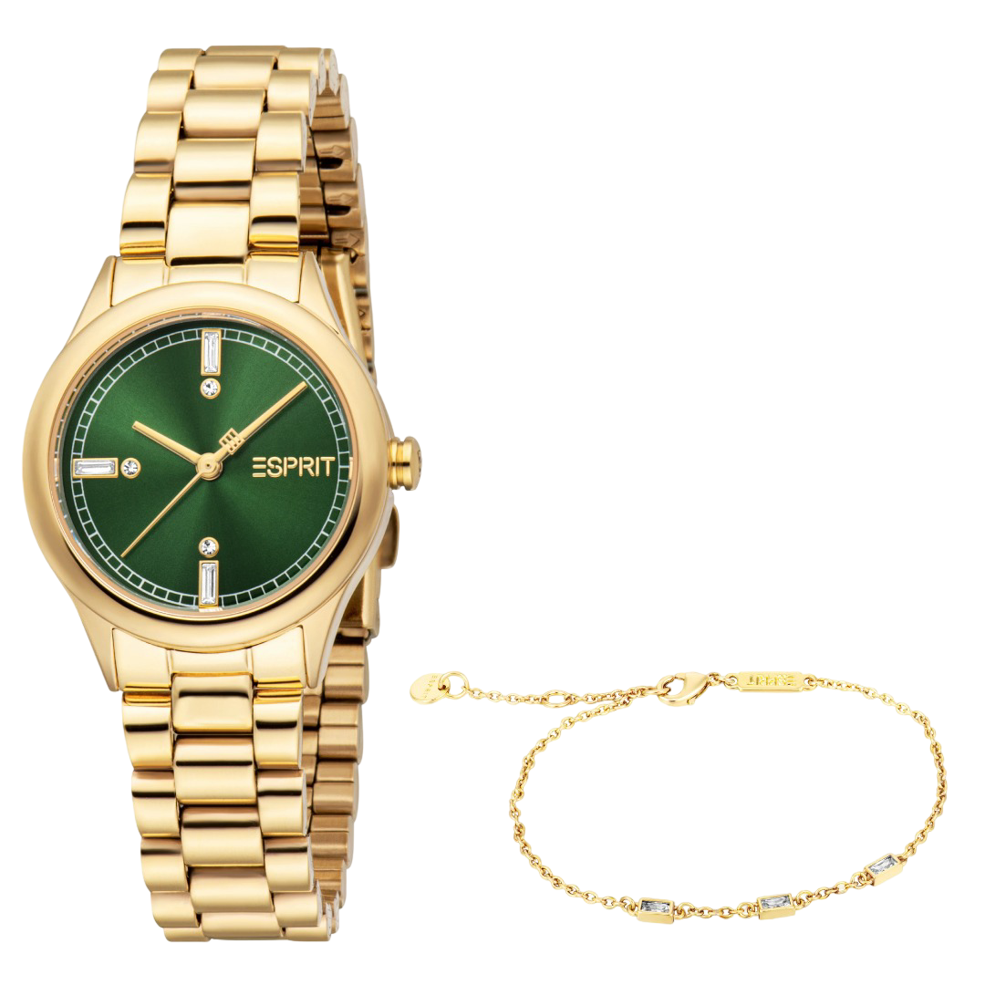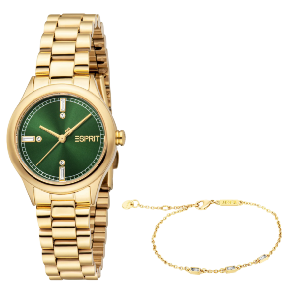 The Esprit Women’s Jessa Watch – Model ES1L486M0065 embodies modern sophistication with its sleek design. The polished gold-toned stainless steel case houses a clean green dial adorned with delicate hands and simple hour markers, offering a timeless aesthetic. The stainless steel mesh bracelet ensures a comfortable fit and adds to the watch’s contemporary appeal. Powered by a precise quartz movement and protected by a durable mineral crystal, this watch is built for reliability. With a water resistance of up to 3 ATM (30 meters), it can handle everyday activities, including exposure to light splashes and rain. This versatile timepiece is perfect for women seeking a blend of style and functionality in their accessories.